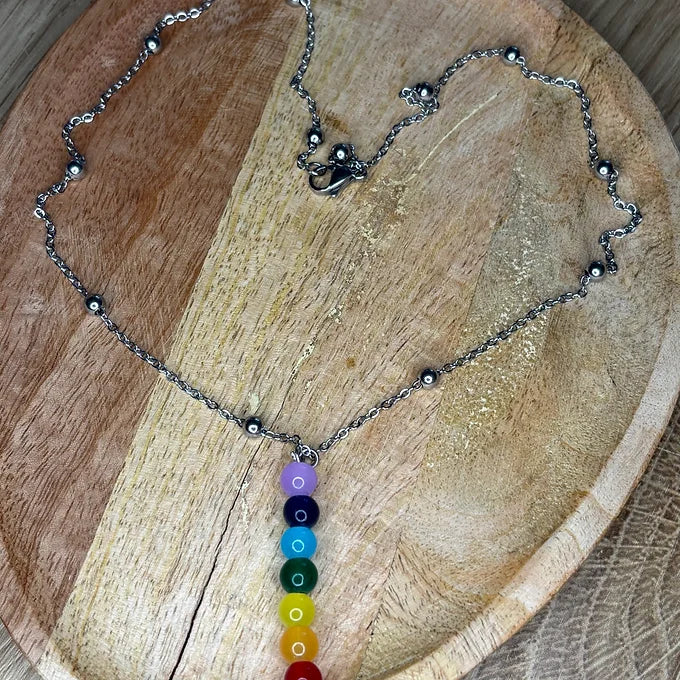 Ce collier artisanal et énergétique en métal argenté, délicatement orné d’une chaîne perlée et d’un pendentif aligné aux couleurs des 7 chakras, est conçu pour rétablir l’équilibre énergétique et favoriser une harmonie intérieure profonde.