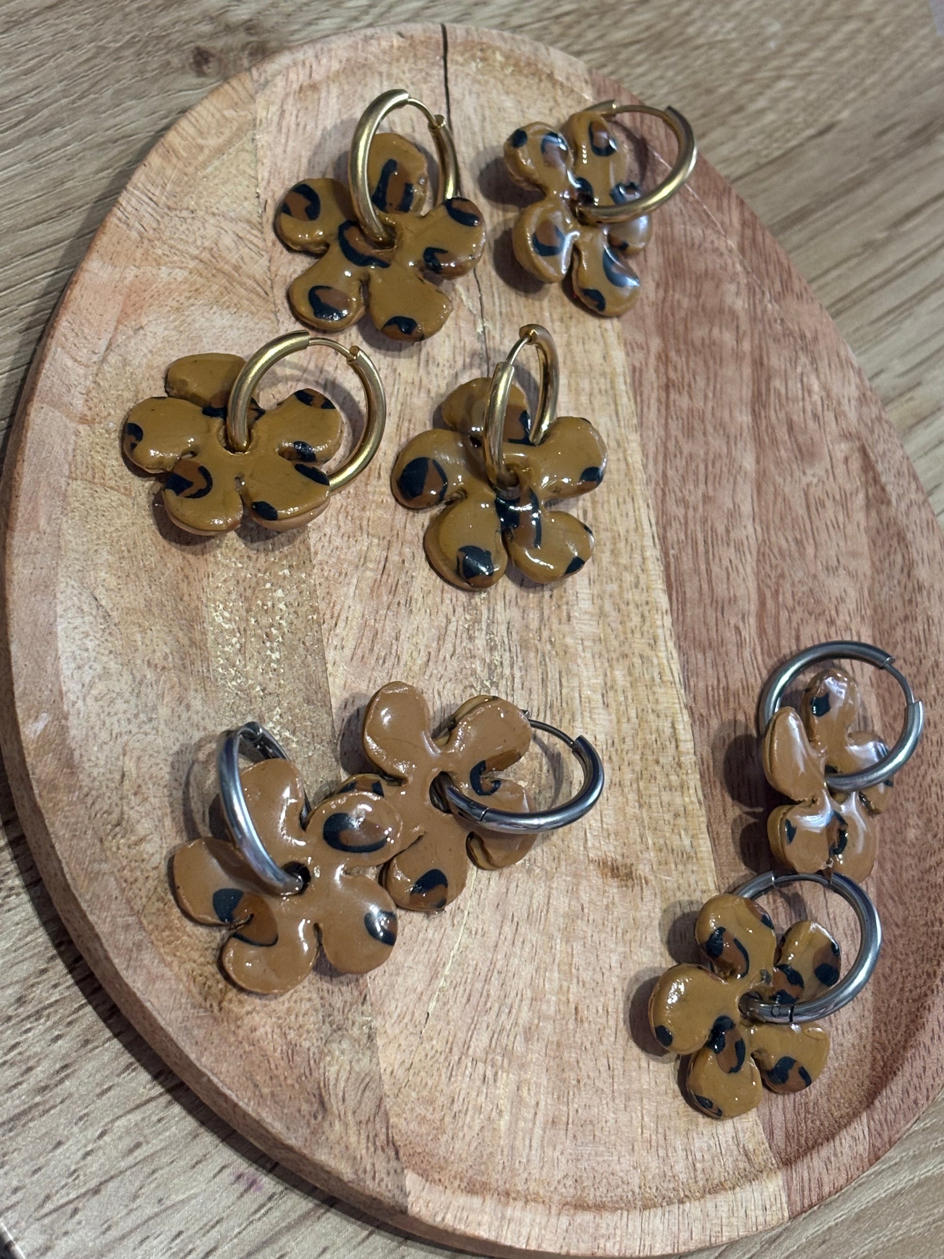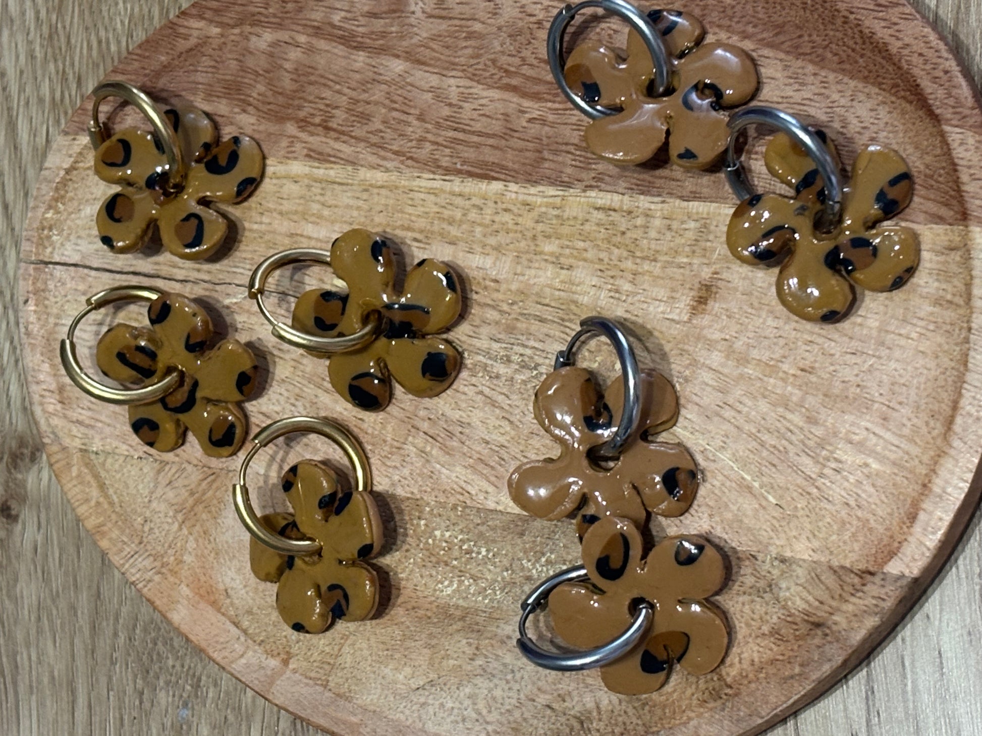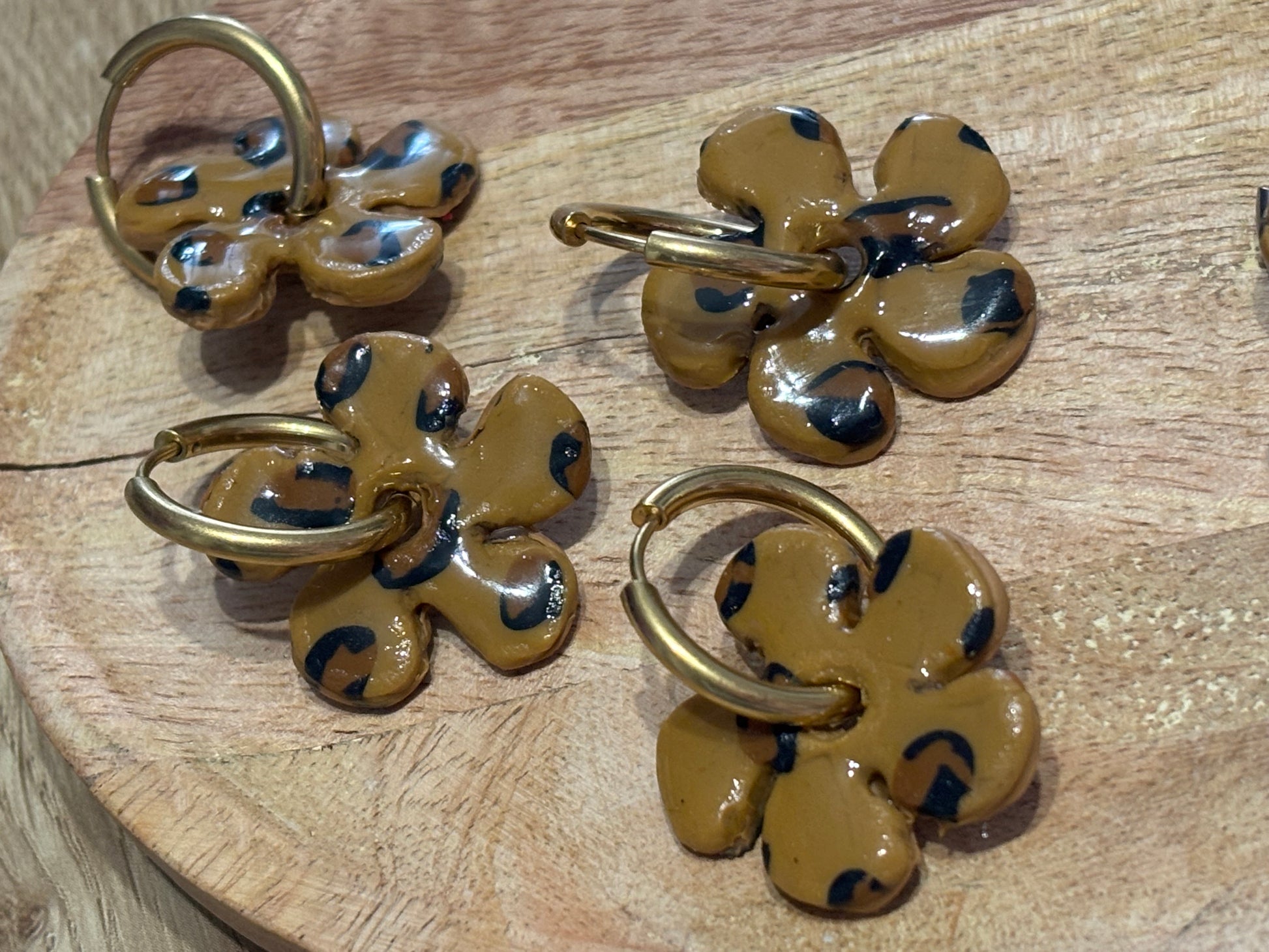 Petites créoles ornées de pampilles fleurs façonnées à la main en pâte Fimo.